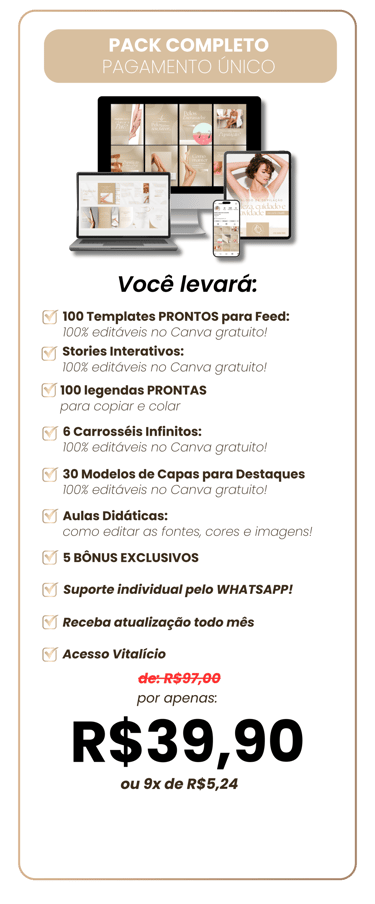 Facilite sua rotina: são mais de 100 posts prontos no Canva Gratuito, lindos, estratégicos e feitos para atrair clientes com muito mais facilidade!