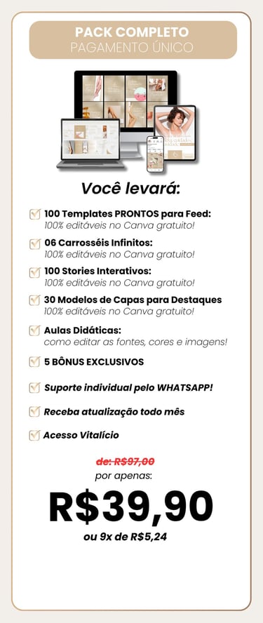 Facilite sua rotina: são mais de 100 posts prontos no Canva Gratuito, lindos, estratégicos e feitos para atrair clientes com muito mais facilidade!